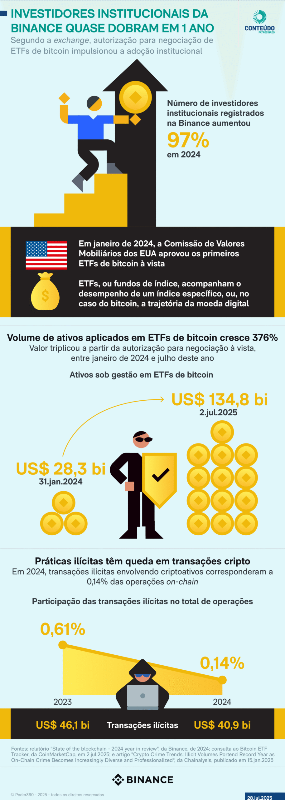 nvestidores institucionais se interessam cada vez mais por criptomoedas como forma de montar um portfólio de investimentos diversificado e seguro para os clientes. Só na Binance, o aumento foi de 97% na quantidade de registros desse tipo de investidor em 2024. O dado está no relatório “State of the blockchain – 2024 year in review”, divulgado pela corretora –a maior exchange cripto em volume de negócios, conforme a CoinMarketCap.